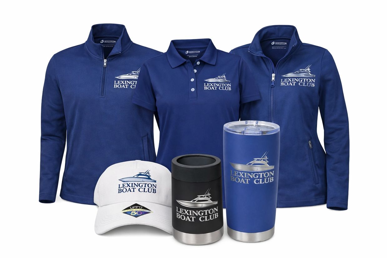 The Lexington Boat Club merchandise page features a small-curated lineup of embroidered-logo apparel and accessories—mostly performance tops and practical outerwear—so members can wear the club logo on and off the water. Every item listed is described as having the Lexington Boat Club logo embroidered on it. Merchandise is now available at the Lexington Pro Shop.